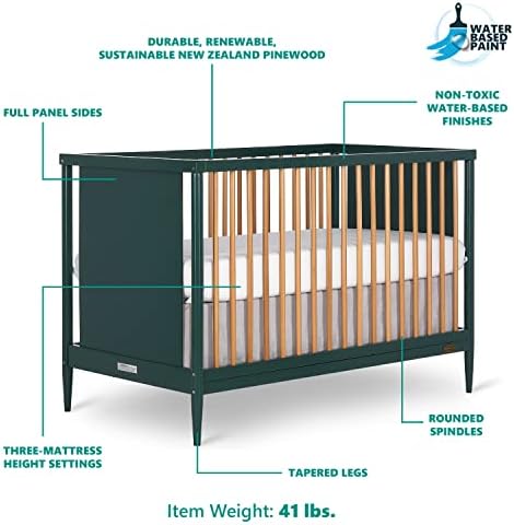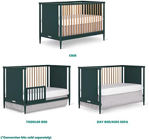 Dream On Me clover crib is a must have, inspired by mid-century modern. It’s refined design offers simple clean lines, full side panels, rounded spindles and completed with tapered legs, this timeless crib will effortlessly fit into any nursery decor. This modern crib is designed using solid wood construction that makes it as durable as it is beautiful which converts to a toddler bed, day bed and sofa to accommodate your growing child (conversion rails sold separately). The crib is featured in three non-toxic finishes – We combined a breathtaking olive green with natural tones to create a sense of tranquility, modern white finish and natural white finish. Can inspire muted palettes or vibrant shades that are equal parts elegant and serene.